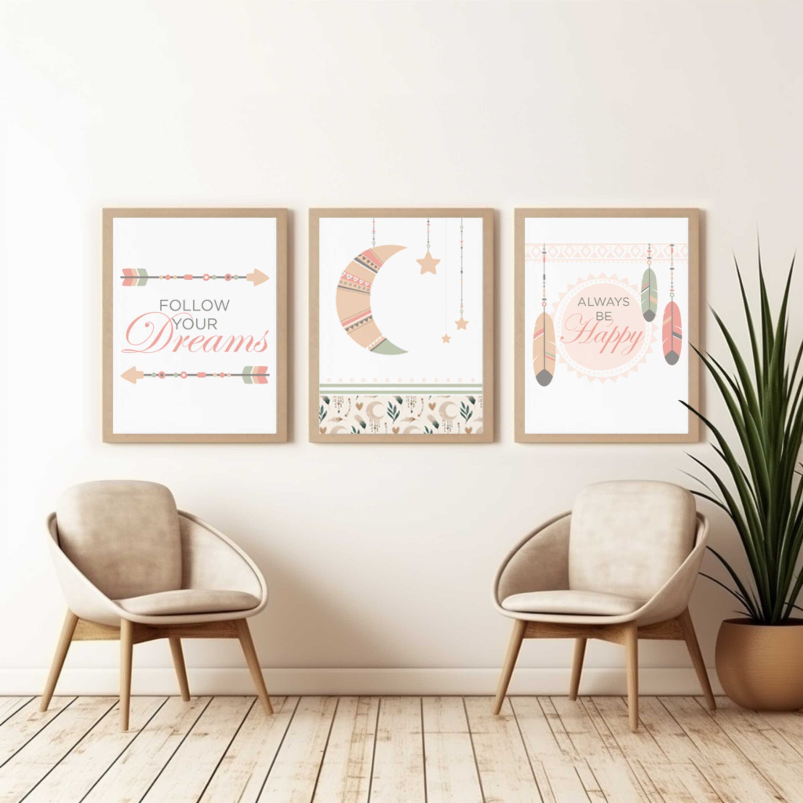 A quick and budget-friendly way to elevate the ambiance of your nursery is by incorporating charming wall art prints. This delightful set features three beautifully crafted bohemian designs that will add a whimsical touch to your child’s space. For optimal vibrancy and texture, we recommend printing these artworks on high-quality linen paper, which will enhance their visual appeal and provide a soft, inviting backdrop for your nursery.