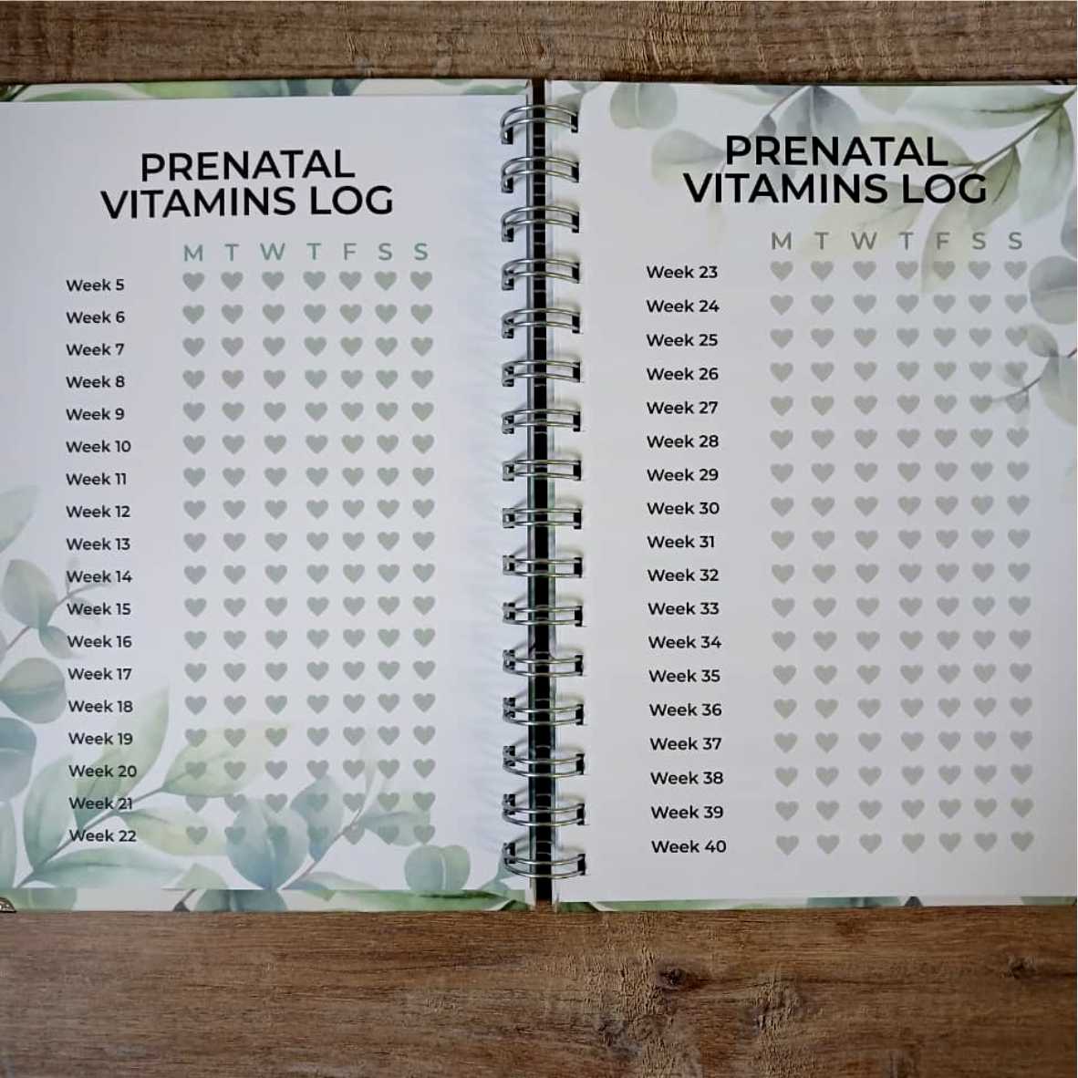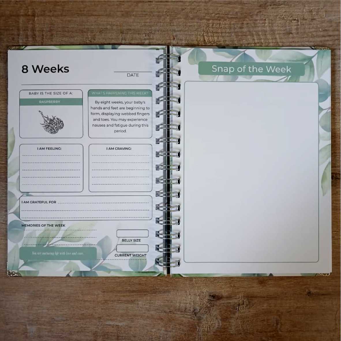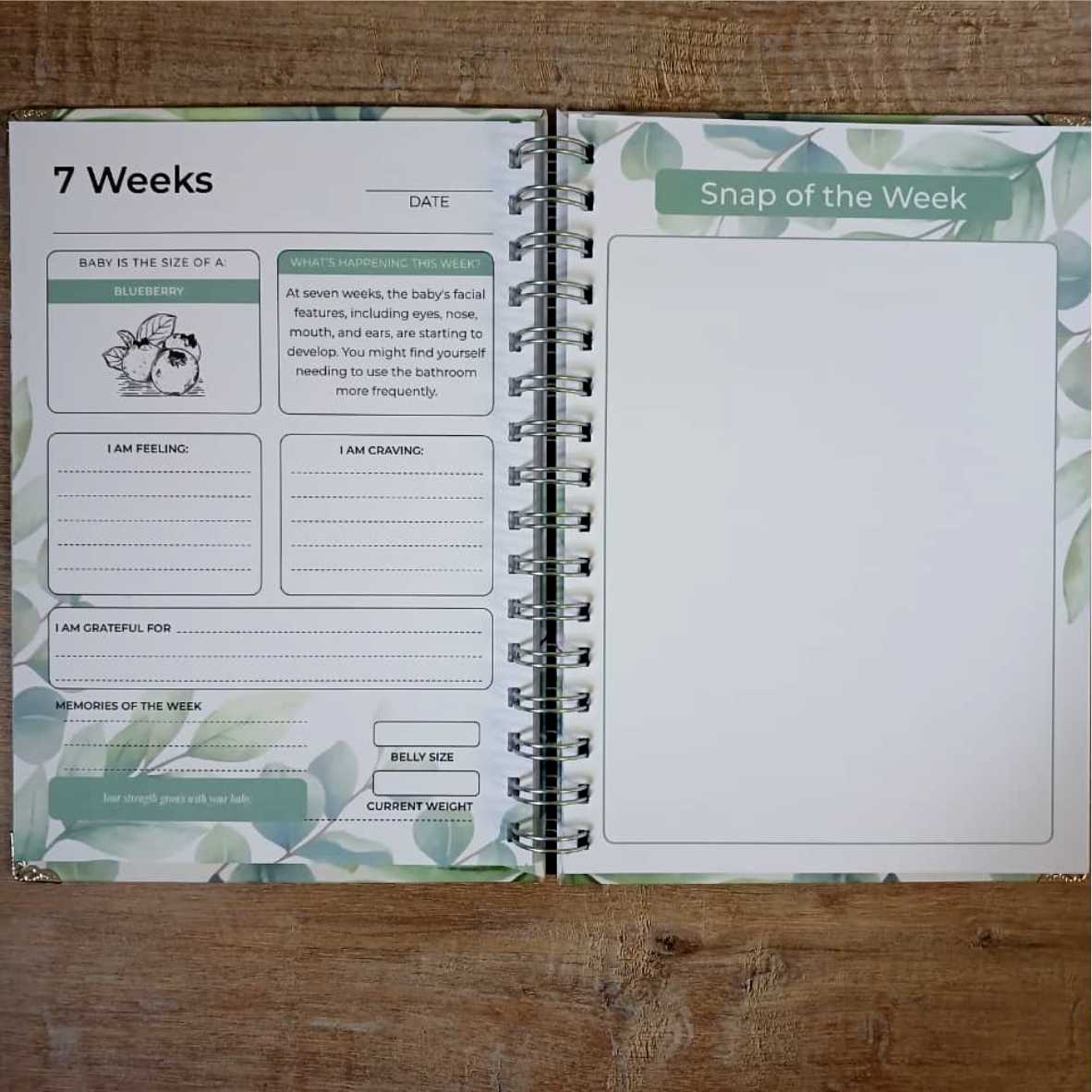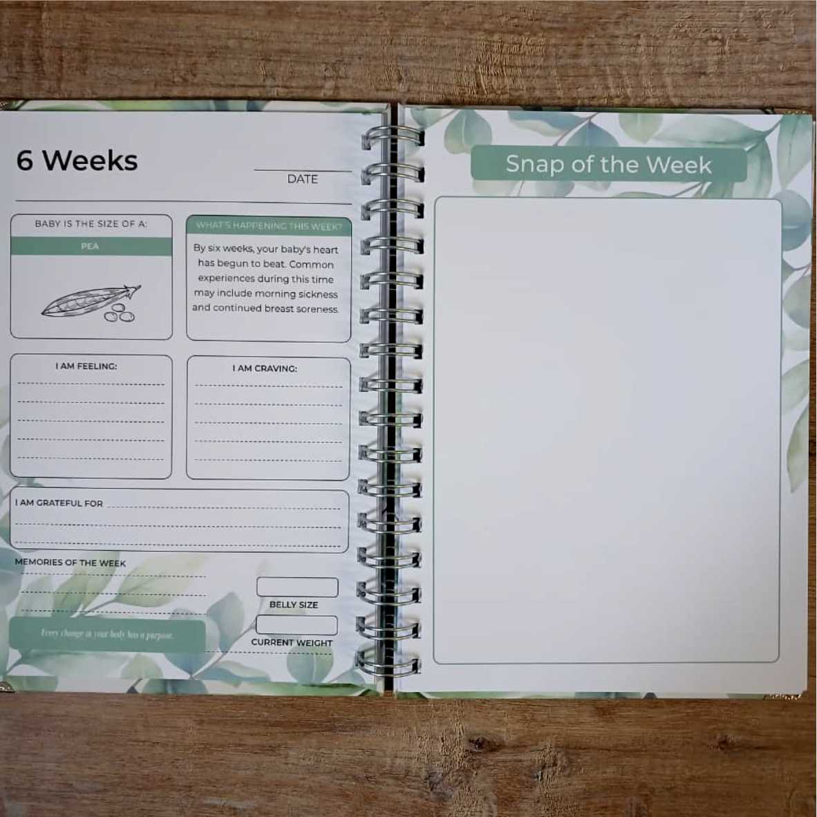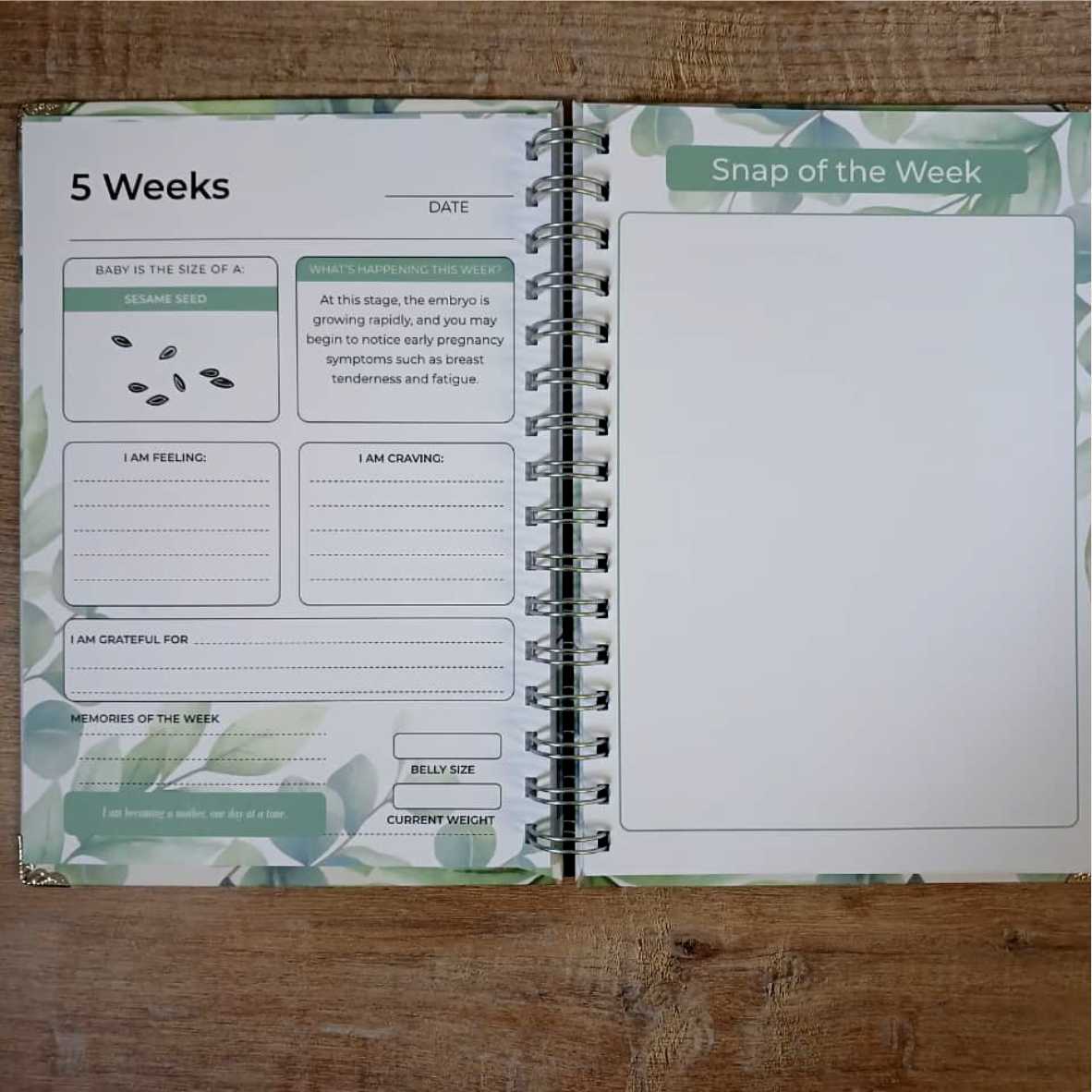 The journal features a guided weekly section from 5 to 40 weeks, offering space to reflect, record milestones, and document how you’re feeling along the way. Each week also includes a dedicated page for your growing bump photos—creating a treasured visual story of your pregnancy.